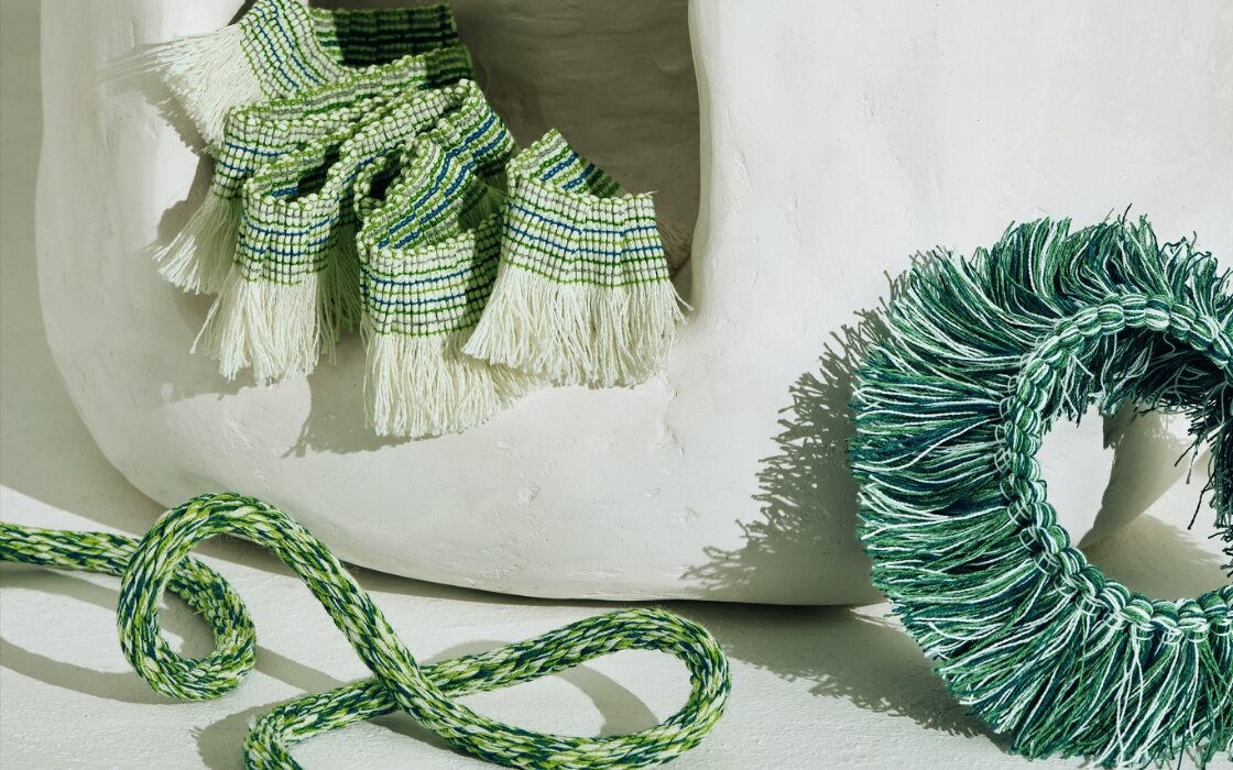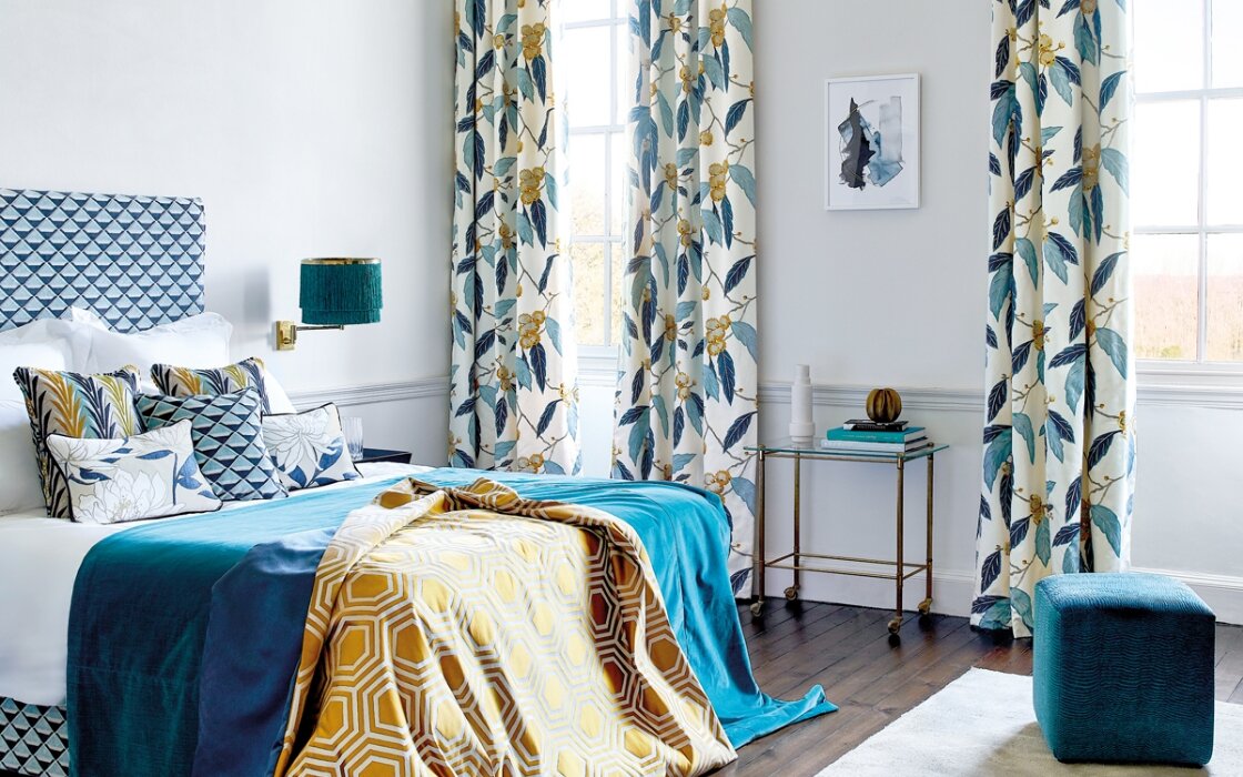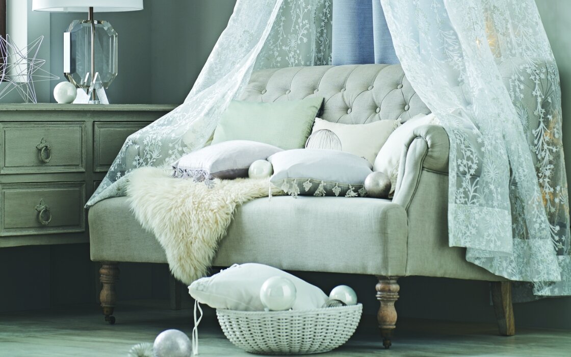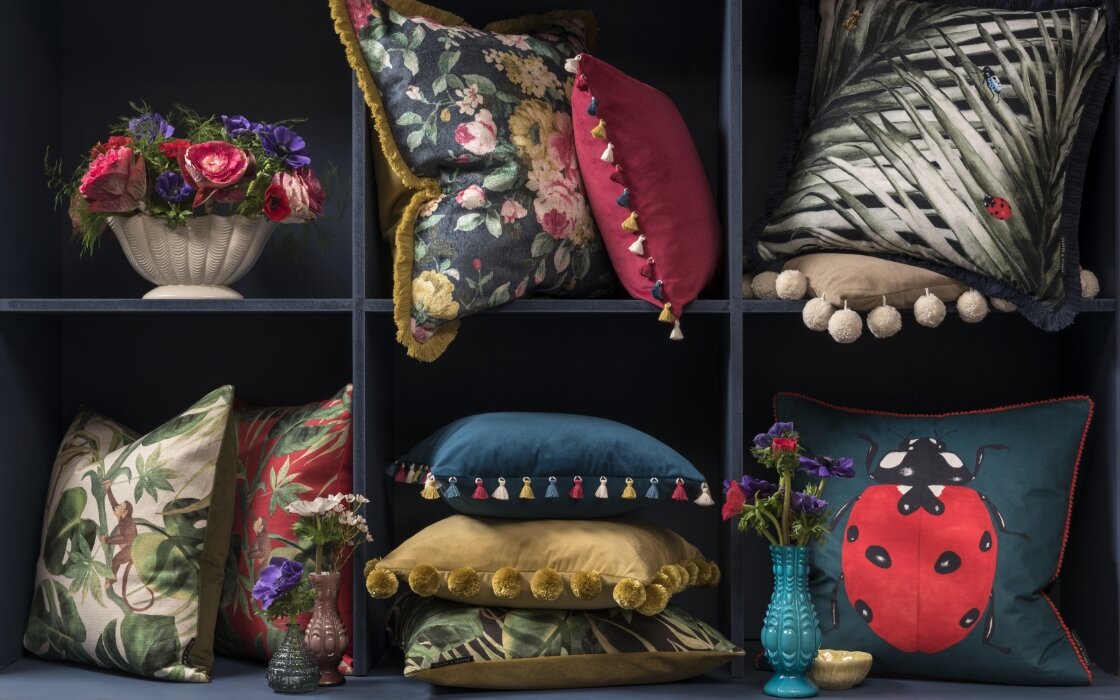 窓辺を演出する豊富なアクセサリー。ファブリックを使用したクッションやベッドリネンなども。