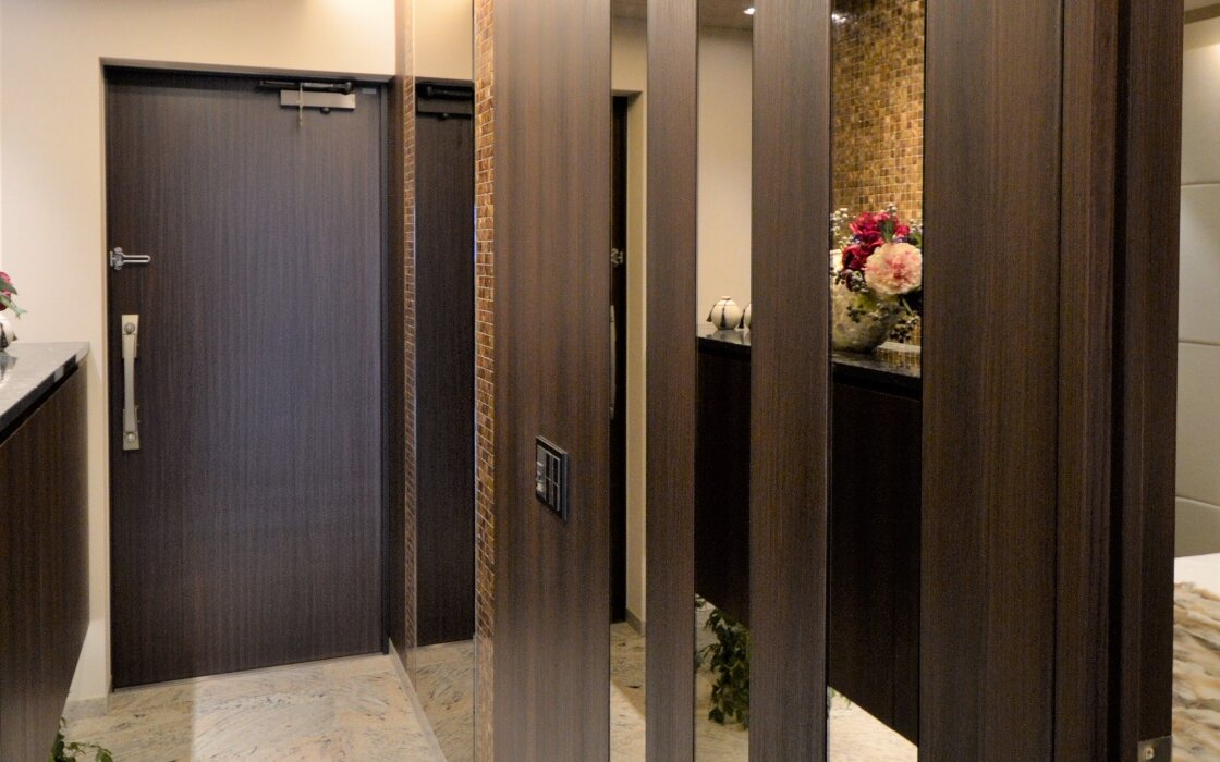 デザインパネルや、装飾的なモールドなどを使い壁にアクセントを。その他にも造作棚や、鏡などを使ってオリジナリティのある空間に。