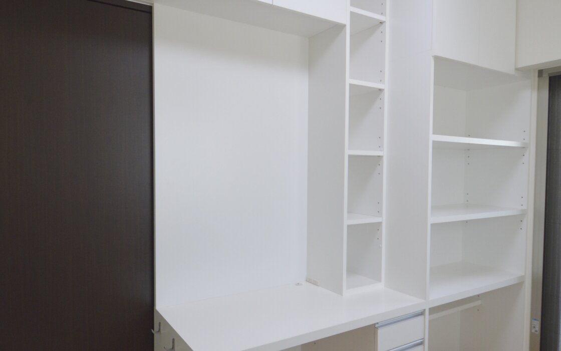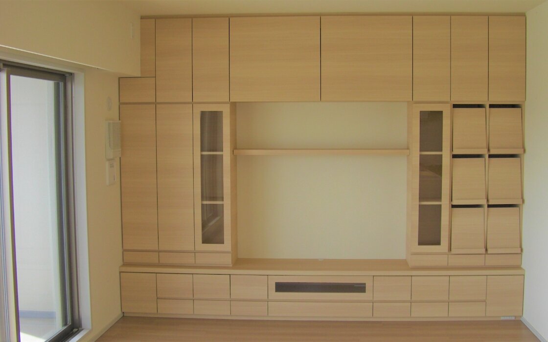 天井から床までのたっぷり収納や、マンション特有の梁や欠けなども余計な隙間が出来ません。また、建具やお持ちの家具などと、色・素材を合わせて一体感を出し製作する事が可能です。